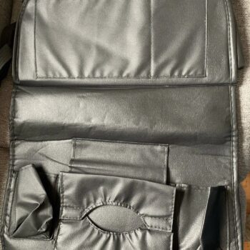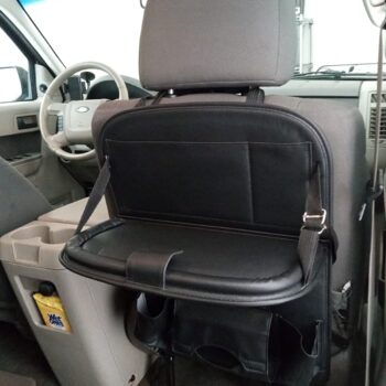 This car organizer is decent for the back seat to use on a road trip. I like the fold-down tray, but the tray isn’t very strong. I don’t think it would support a laptop. I used it for my phone and sunglasses. I like the umbrella holder. The tissue box holder was an odd size, so that didn’t work for me. I put a package of wet wipes there instead.